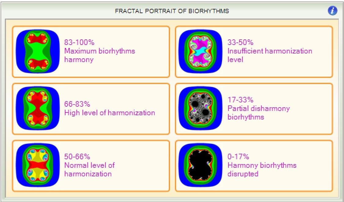 Fractale harmonie van bioritmen op alle regulatieniveaus duidt op grote energiebronnen, een optimale energiehuishouding en een goede gezondheid en balans van de energievoorziening en een gunstige prognose wat betreft veranderingen in de gezondheidstoestand.