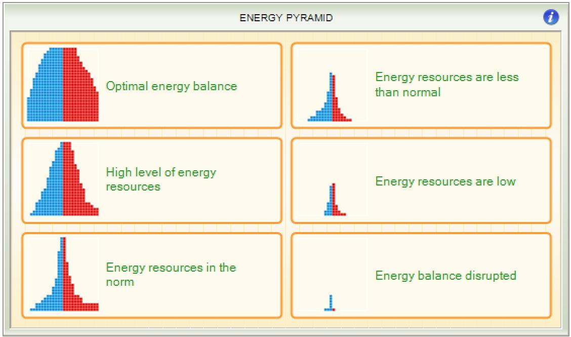 De energiepiramide karakteriseert het totaal van de fysiologische hulpbronnen van het organisme en de balans tussen de cycli van opbouw en verbruik van hulpbronnen onder de huidige omstandigheden van het levenstempo.