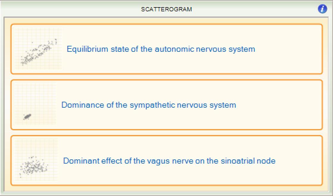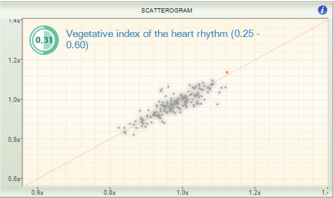 Hogere dichtheid van de "wolk" van het scatterogram en de neiging naar de linker benedenhoek betekent een overwicht van het sympathische zenuwstelsel.